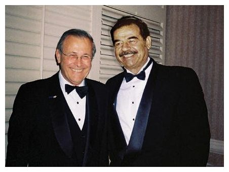 I remember the photo of Donald Rumsfeld with a big smile, glad-handing Saddam after sealing a military sale of chemical and biological weapons to Iraq. Reagan was so desperate to have a “friend” in that part of the world that he was able to overlook a lot, including trafficking chemical weapons through a CIA front company in Chile because they were banned by international law, including an American war ship getting hit with several Iraqi missiles, killing 37 American sailors.
